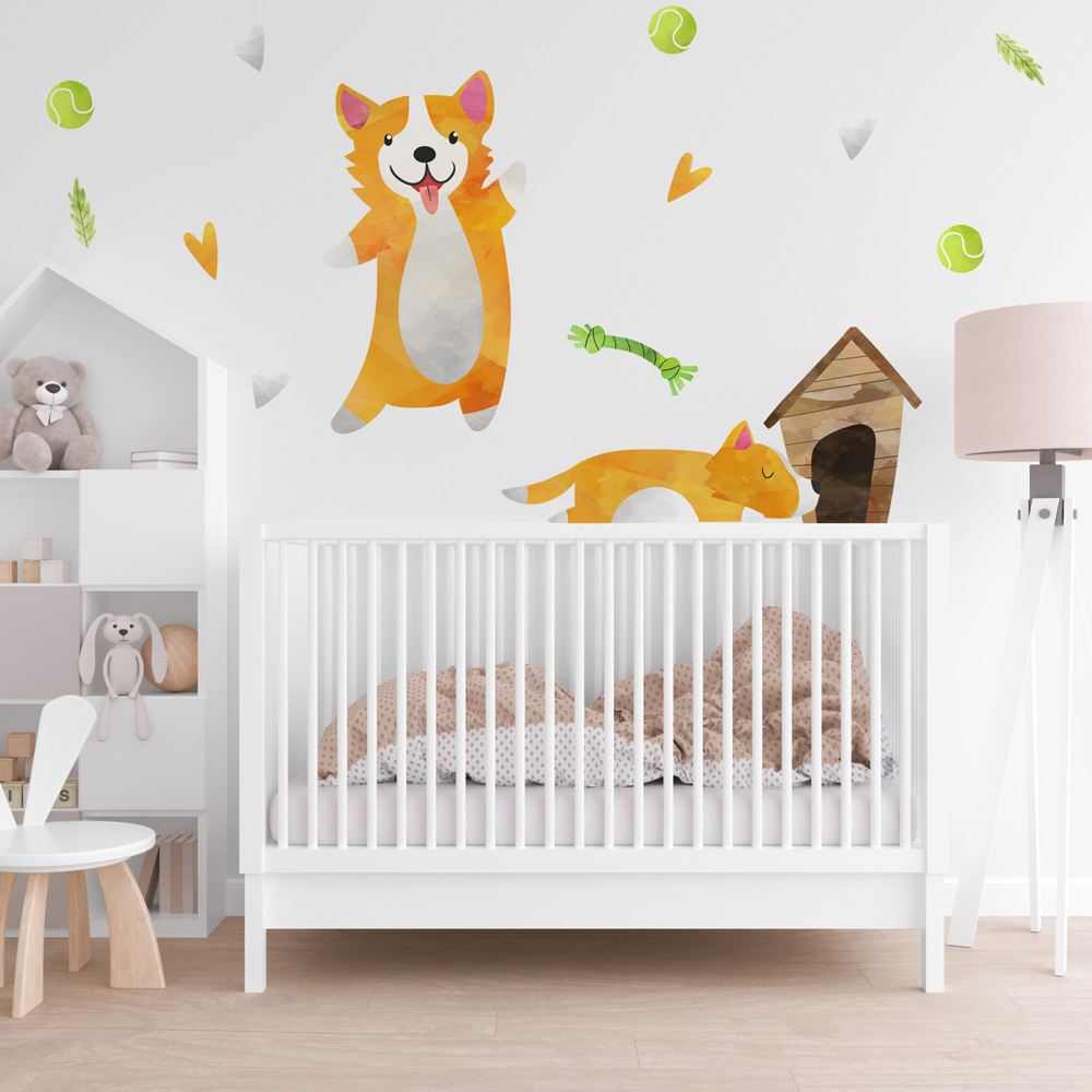 Samolepící textilní fólie s veselými pejsky a jejich hračkami. Samolepící fólii můžete snadno nalepit na stěnu, dveře, nebo skříň v dětském pokoji.